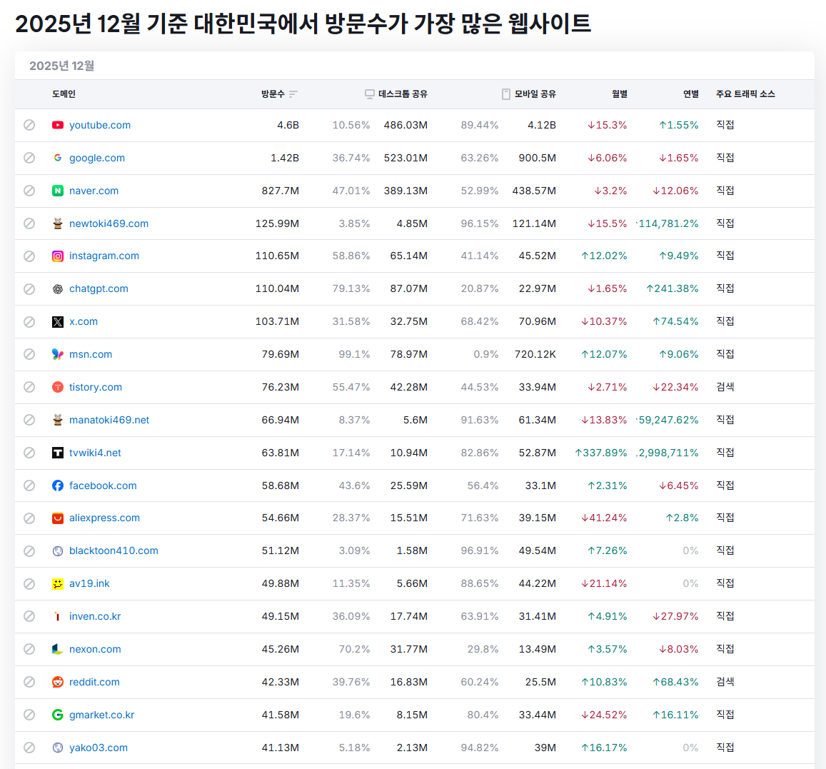2026년 1월 기준, 한국에서 가장 많은 트래픽을 기록한 웹사이트 순위입니다. 글로벌 플랫폼이 압도적이며, 국내 포털과 쇼핑몰이 그 뒤를 잇고 있습니다.